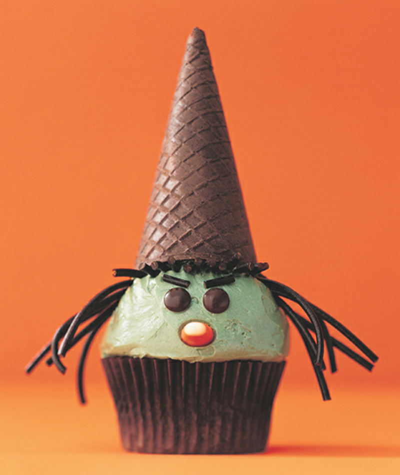 Green-faced, straggly-haired witches may look mean, but they are actually sweet chocolate cupcakes dressed up for Halloween. Inverted chocolate ice-cream cones make perfectly pointed hats. Bake a coven’s worth and set them out on display to greet and treat Halloween party guests.