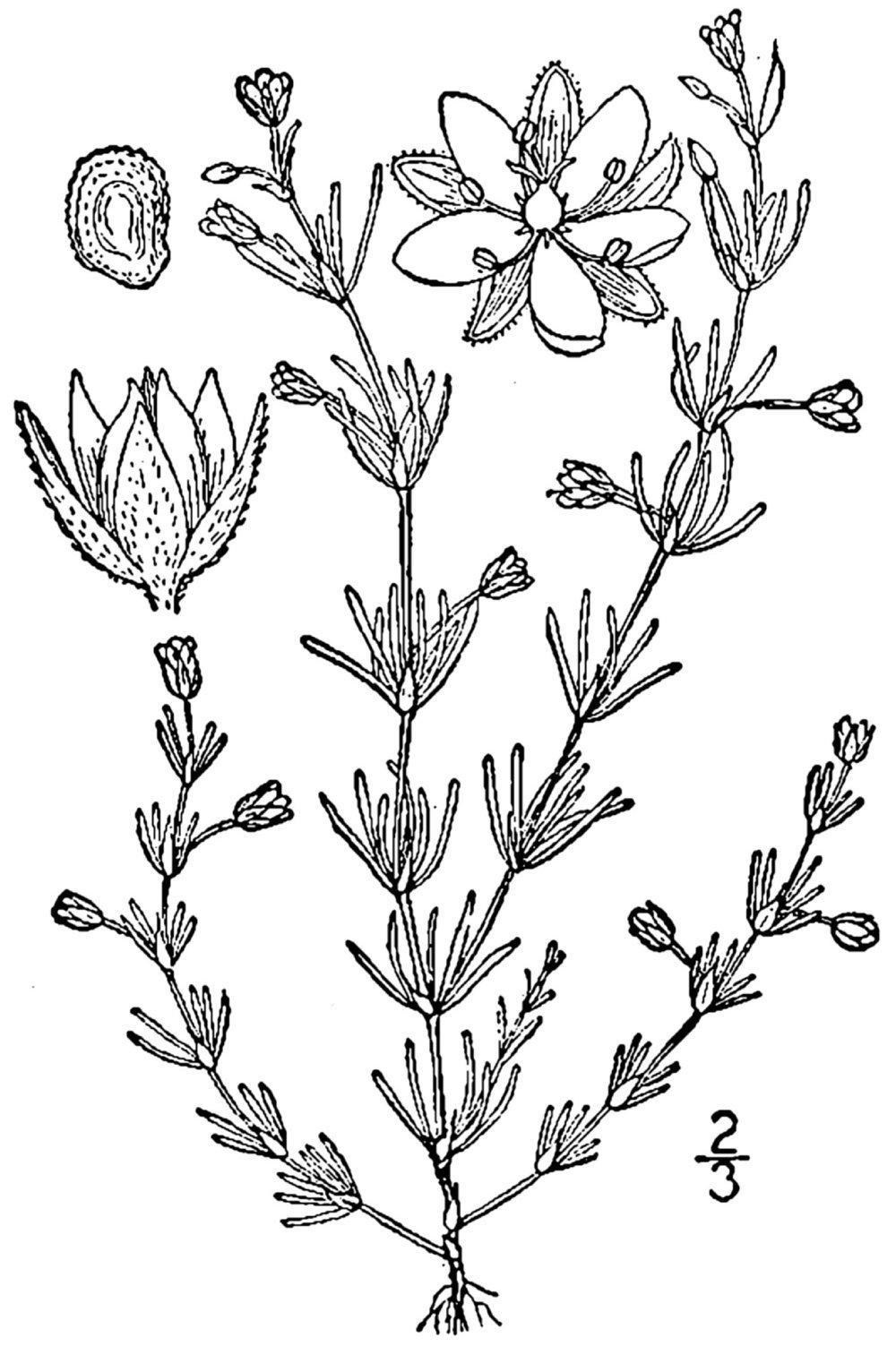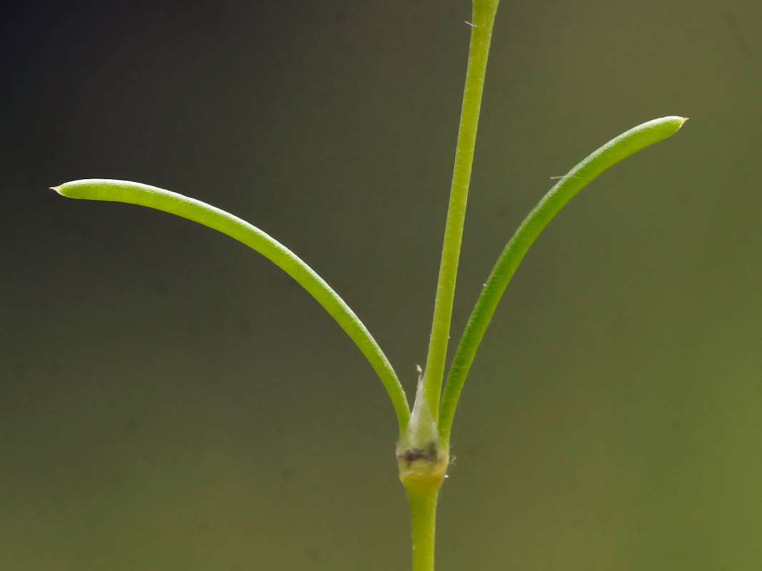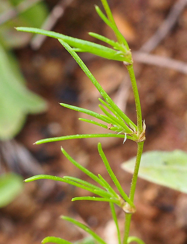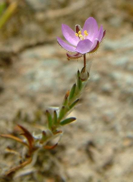 Red sandspurry is an annual to short lived perennial plant having slender taproots. It has prostate to erect stems that are glandular to hairy, branched, 4 to 30 cm long and 0.3 to 0.5 mm in diameter. The plant bears linear, clustered, opposite, dark green, fleshy, glabrous or hairy leaves which measures 4 to 20 mm long and 1 mm wide having pointed tips. It has silvery and lanceolate stipules which is about 3.5 to 5 mm long and unites to enclose nodes. Flowers have five petals, five sepals and six to ten stamens. It is arranged singly or in small clusters in the leaf axils. Petals are obovate to ovate, pink to pale red and measures 2 to 3.5 mm long. Sepals are glandular to hairy and are fused at a base for 0.5 to 0.7 mm. The capsules are three valved, green to tan and is about 3.5 to 5 mm long. Seeds measure 0.4 to 0.6 mm long having net like veins.