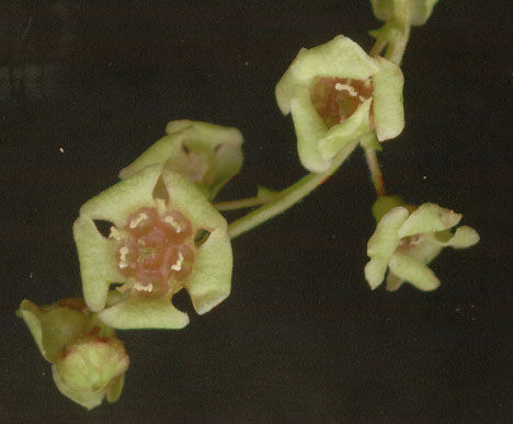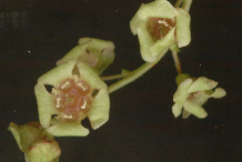 Inconspicuous, yellow-green, pentamerous in 10–20 flowered, 4–8 cm long pendulous racemes, campanulate (bell-shaped), with 5 purplish petals at the end.