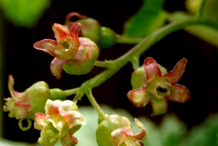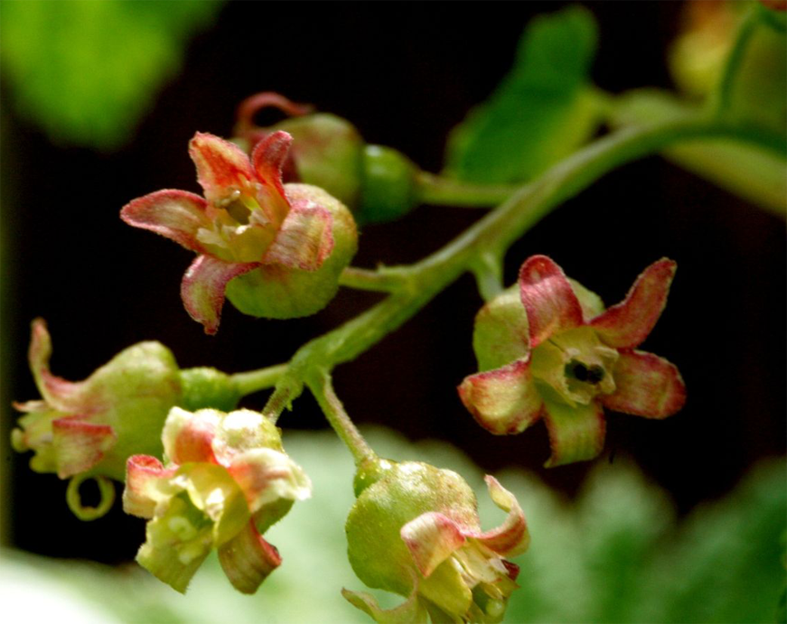 Currant flowers borne toward the bases of one-year old stems and on spurs on older stems. They appear in early spring with new growth. Each flower bud opens to number of flowers (up to 20), joined together on a delicate, drooping 5 – 6 inch stem, and called a strig. The strig length is reduced or flowering is suppressed by lack of winter chill. Individual flowers (green in the case of redcurrants and blush pink for black currants) are not showy, but joined together on the strig they give the bush a lacy texture. Depending upon the cultivar, fruits ripen from 70 to 100 days after blossoming.