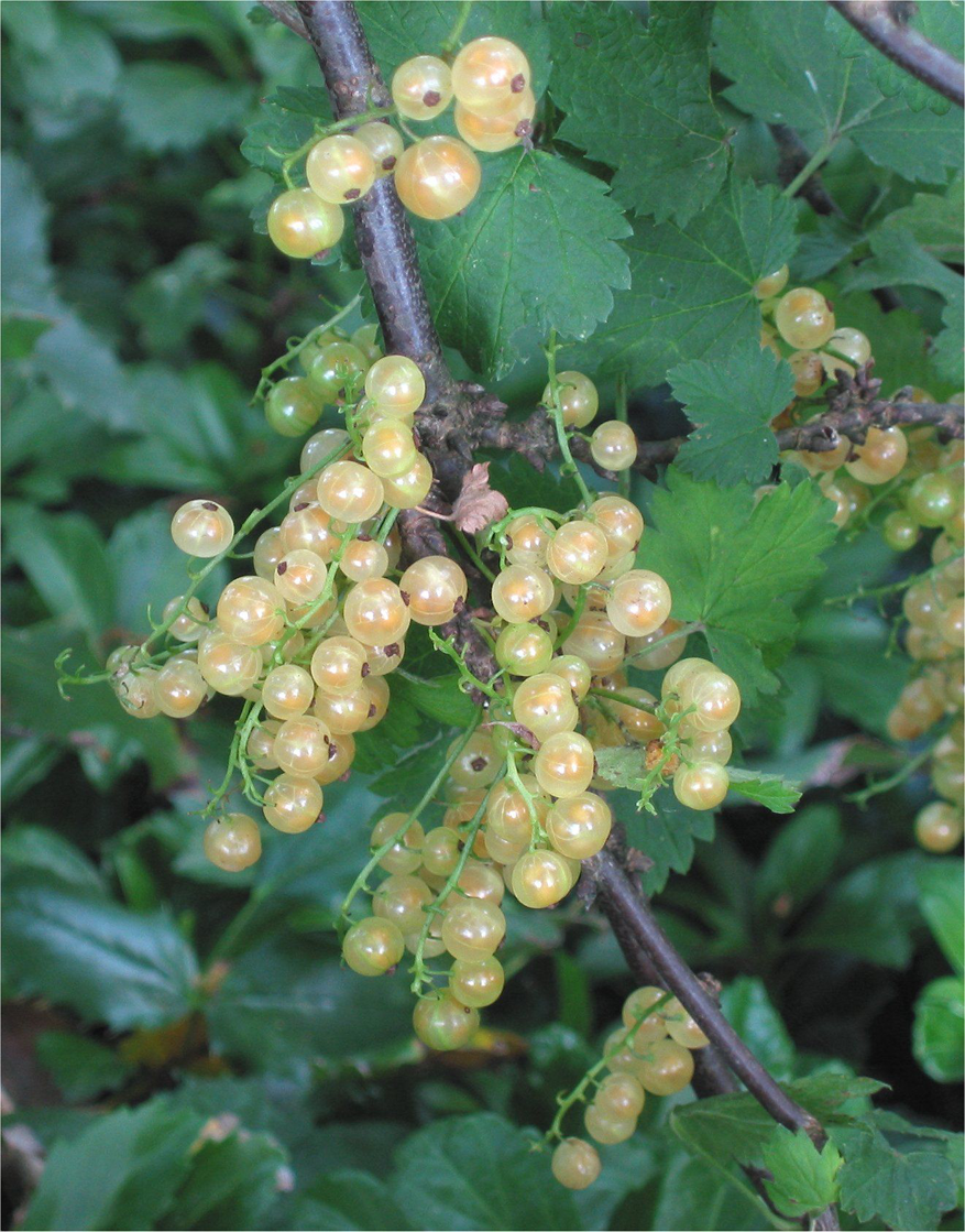 Fully set strigs will be a pendulous chain of small berries. The fruit is easier to pick if their strigs are long and have “handles” (clear lengths at the bases) for holding onto while harvesting. Black currants commonly ripen from the top down, encouraging birds to strip berries as they color. Modern redcurrant varieties have been selected for their ability to ripen all the berries on a strig at once. Berries are smooth skinned, globose, pleasantly acid, glabrous, about 8–12 mm diameter, with 3–10 berries on each raceme. The berries contain 3 – 10 minute, bony seeds.