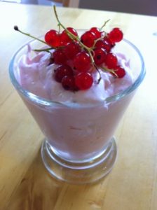 Add the yoghurt and fruit puree to this and mix in well. Fold in the remaining fruit, leaving some to decorate the top of the fool with, and mix well.