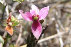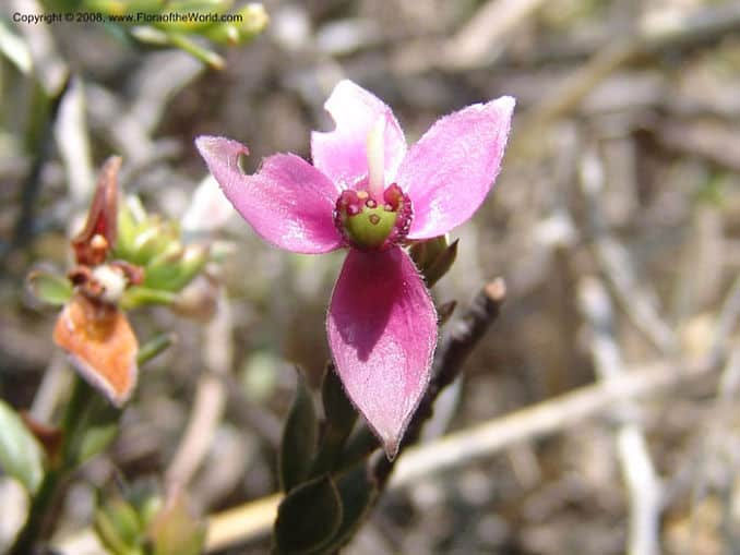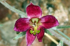 | Flower | Flowers, which grow from the leaf axils, have four petals which are red on the inside and have grey hairs on the outside. These petals frame three striking-looking stamens. The unusual thing about the flowers is that they do not produce nectar to attract insects. Instead they produce an odourless oil in special glands called elaiophores |