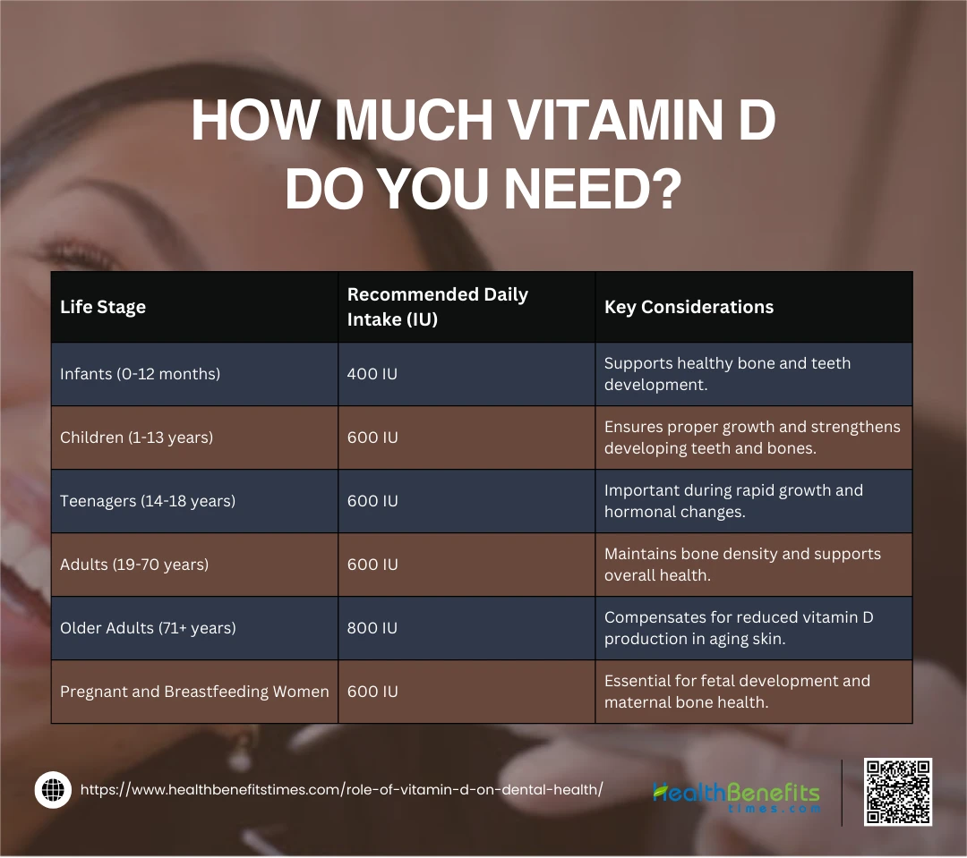 Children (1-13 years) 600 IU Ensures proper growth and strengthens developing teeth and bones.