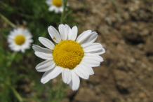 Roman Chamomile is a low growing carpeting hardy perennial plant that grows about 10 – 30 cm (12 inches) tall. It is found growing in dry fields and around gardens and cultivated grounds and prefers average, medium, well-drained soil. The plant has hairy stem and leaves are alternate, bi-pinnate, finely dissected, and downy to glabrous. The plant has solitary, terminal flower heads, rising 20–30 cm (8–12 in) above the ground; consist of prominent yellow disk flowers and silver-white ray daisy-like flowers. Flowering normally takes place from May to September. Fruit is cypselas obovoid, 1 – 1.5 mm long, smooth, with 3 faint striae on inner side, bald.