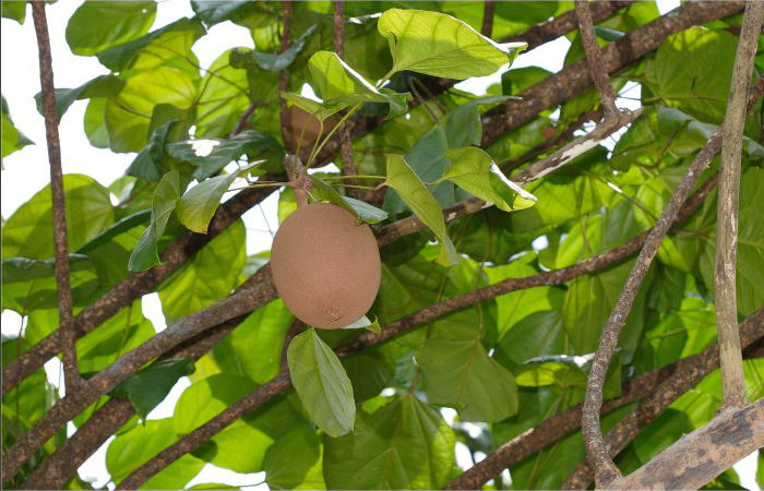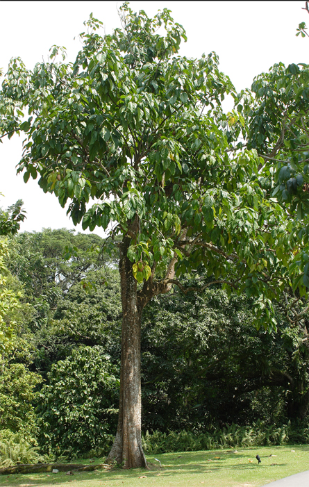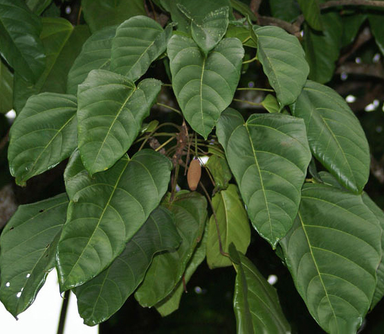 Rowal fruit is actually a medium to large; much branched, evergreen perennial tree sized 18–40 m tall. The tree prefers little shade and is normally found growing in a slightly acidic soil. It is also found along riverbanks and inundated areas and on stony and clayey soils. It grows rapidly in the initial years. Trunk is up to 1 m of diameter with grey brown bark. Leaves are entire, broadly ovate, cordate to truncate base, 15–25 cm long, 3-lobed on young trees, acuminate, glossy green, nerves palmate. Flowers are mostly unisexual; male flowers occur in racemes, to 5 cm wide; with 2–3 calyx-lobes; 5 or 6 petals with a basal scale and many stamens. Female flowers are solitary, similar to male flowers, but have no stamens but with 5–6 staminodes alternating with the petals, ovary long-ovoid, thick-walled, 1-celled with 2–4 placentae and many ovules and sessile stigma.