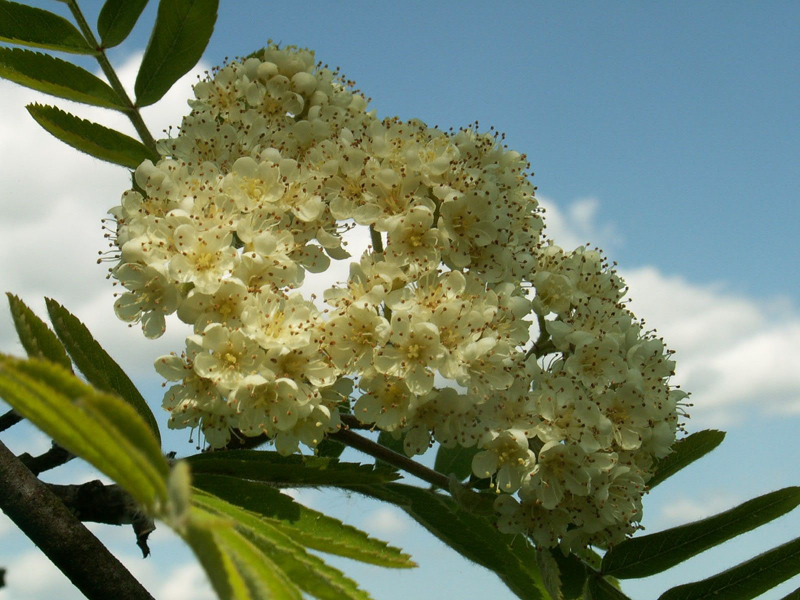 Rowan berries are small, deciduous tree up to 15-20 m high with trunk diameter of 1 m. Leaves are imparipinnate, alternately arranged and 15-25 cm long with oblong to oblanceolate leaflets of 3-5 cm long and 1-2 cm wide. The flowers are hermaphrodite with five creamy white petals of 15 mm diameter and 5-10 mm across. The fruit is a pome of 2-3 cm long and 2 cm diameter. The color of the fruit ranges from bright orange to red, pink, yellow and white. Fruits are obovoid or pyriform which resembles the shape of apple or pear but has bitter taste. The trees have brown, smooth, fissured and flaky bark.
