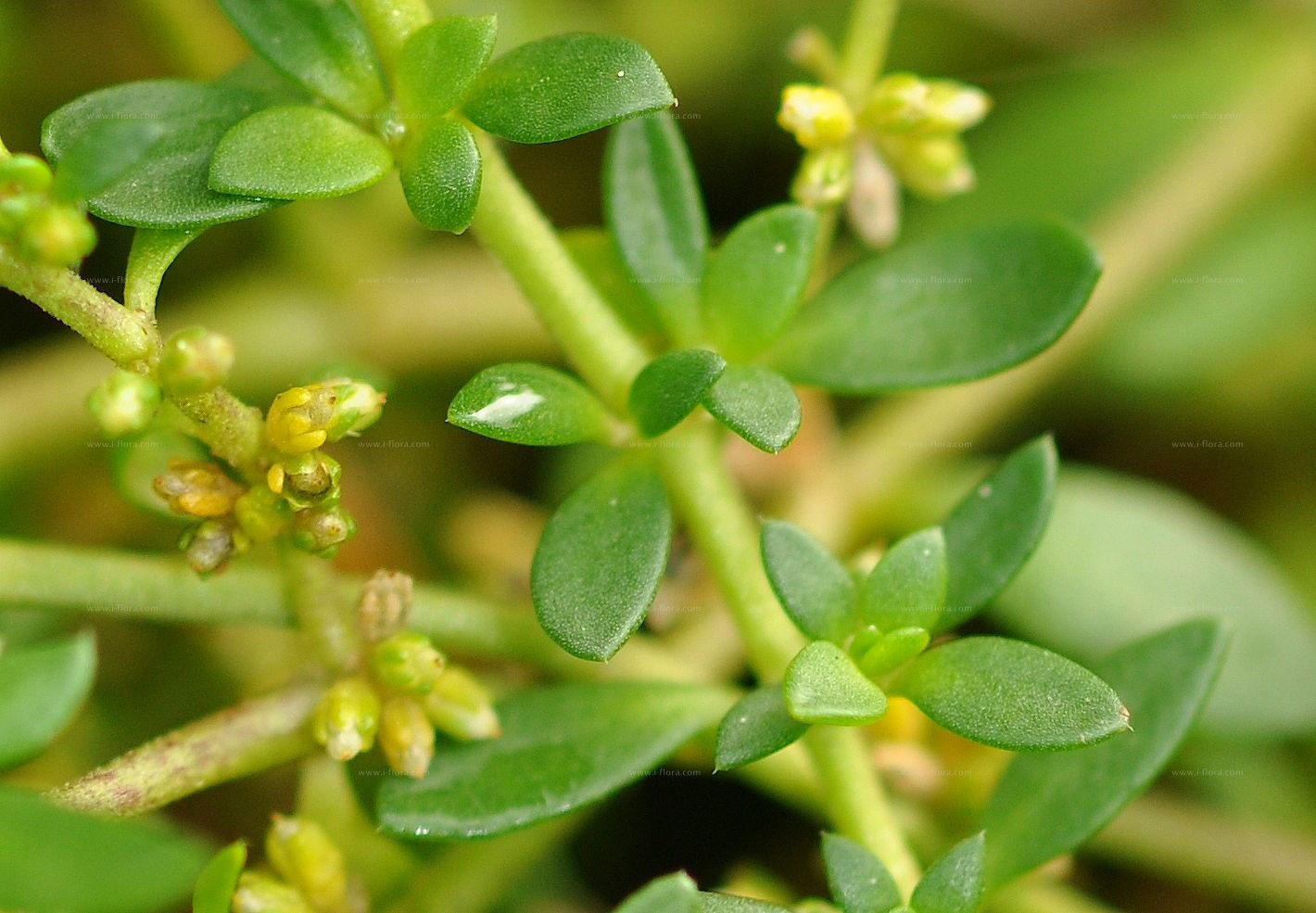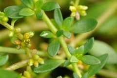 Flowers are very small, and yellow, and sit in small clusters in the leaf axils, hardly discernible from the stalks and leaves. The sepals are green and blunt. Flowering normally takes place in between July to August.