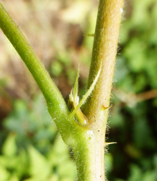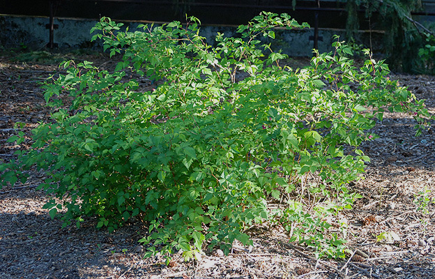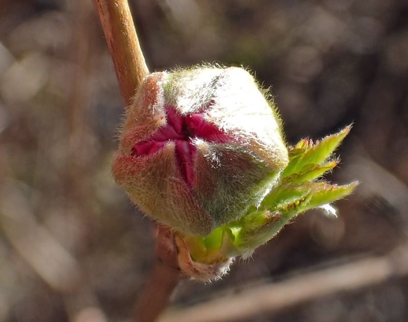 Salmon berry is a deciduous rhizomatous shrub; 1–4 m (40-160 inches or 1.3-13.3 feet) tall normally grows in moist places and wetlands, and is especially abundant along stream sides and riparian areas. Salmon berry plant has erect or arching, woody stems that are covered with fine prickles. Leaves are usually trifoliate (with three leaflets), 7–22 cm (2.8-8.8 inches) long, and the terminal leaflet are larger than the two side leaflets. The leaf margins are toothed. It has somewhat triangular or teardrop shape with jagged edges. Veins in the leaves form visible furrows. Flowers are 2–3 cm (0.8-1.2 inches) in diameter, with five pinkish-purple petals; they are produced from early spring to early summer. Flowering normally starts from March to June.