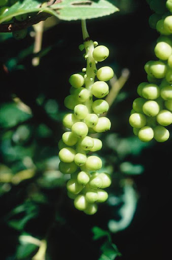 The species itself is dioecious, thus flowers on a female plant will only produce fruit when fertilized with pollen from a male plant. Fertile flowers are followed by small berries, about 1 cm in diameter, whose exocarp and mesocarp are smooth, shiny, of a strong red color. The berries are clustered in grape-like bunches about 10 cm long