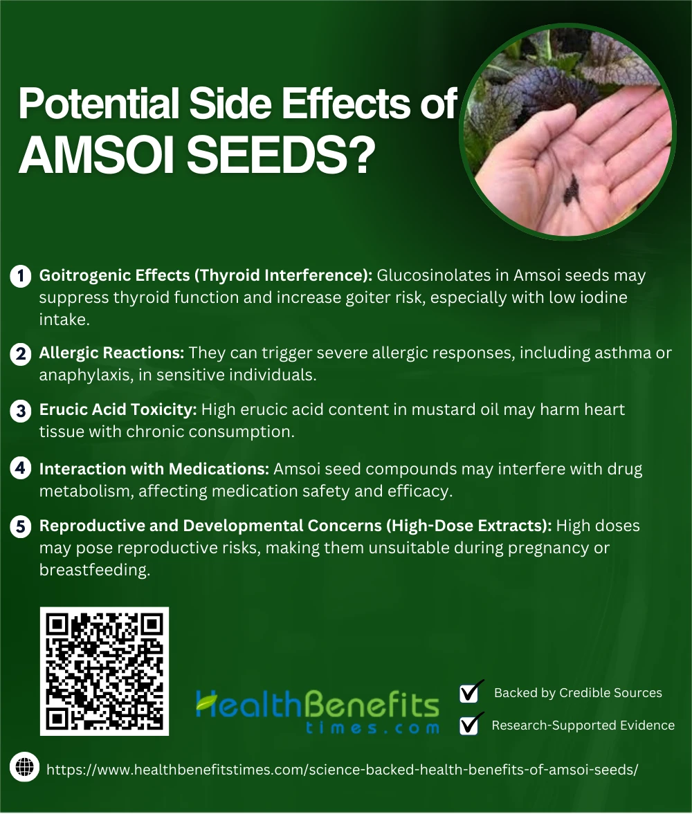 Although generally safe, Amsoi seeds may cause side effects like digestive issues or allergic reactions in some individuals. Overconsumption or interactions with medications can also pose health risks.