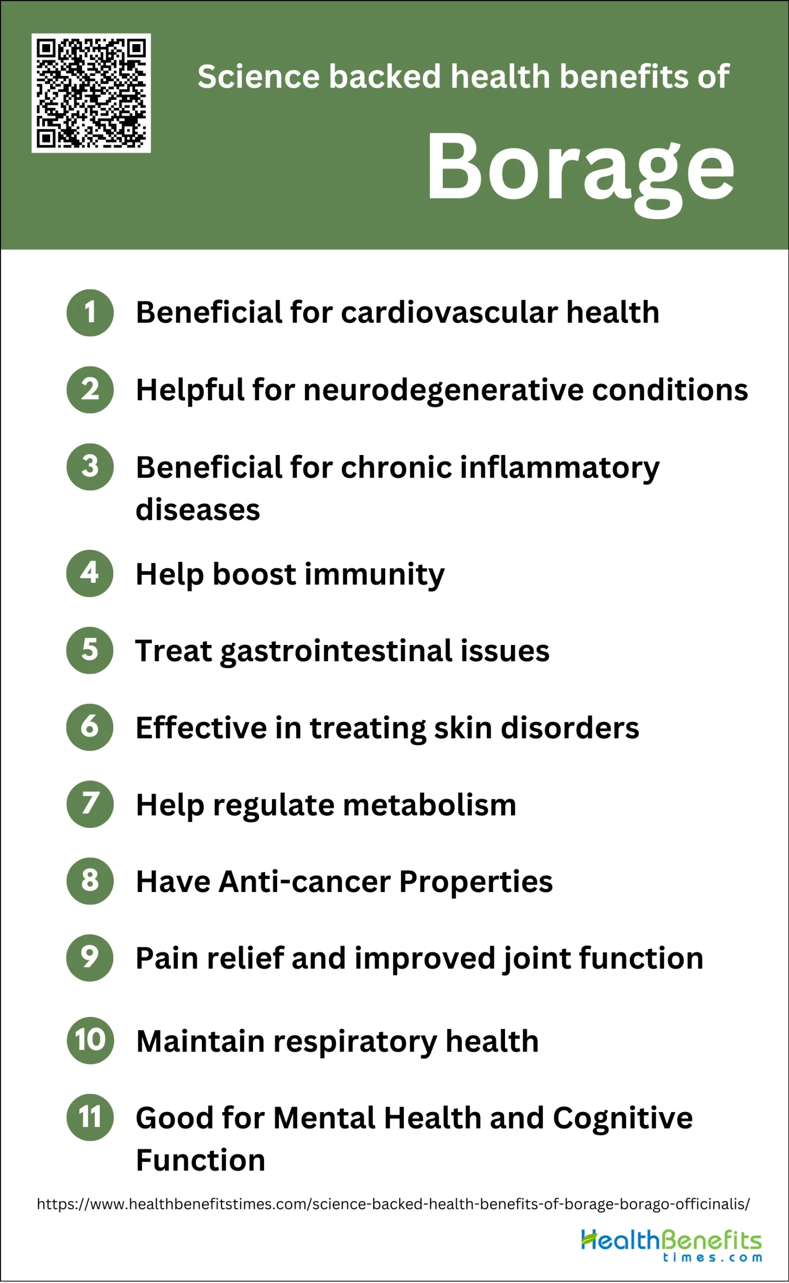 - Borage is a versatile herb with anti-inflammatory, cardiovascular, neuroprotective, and skin benefits.