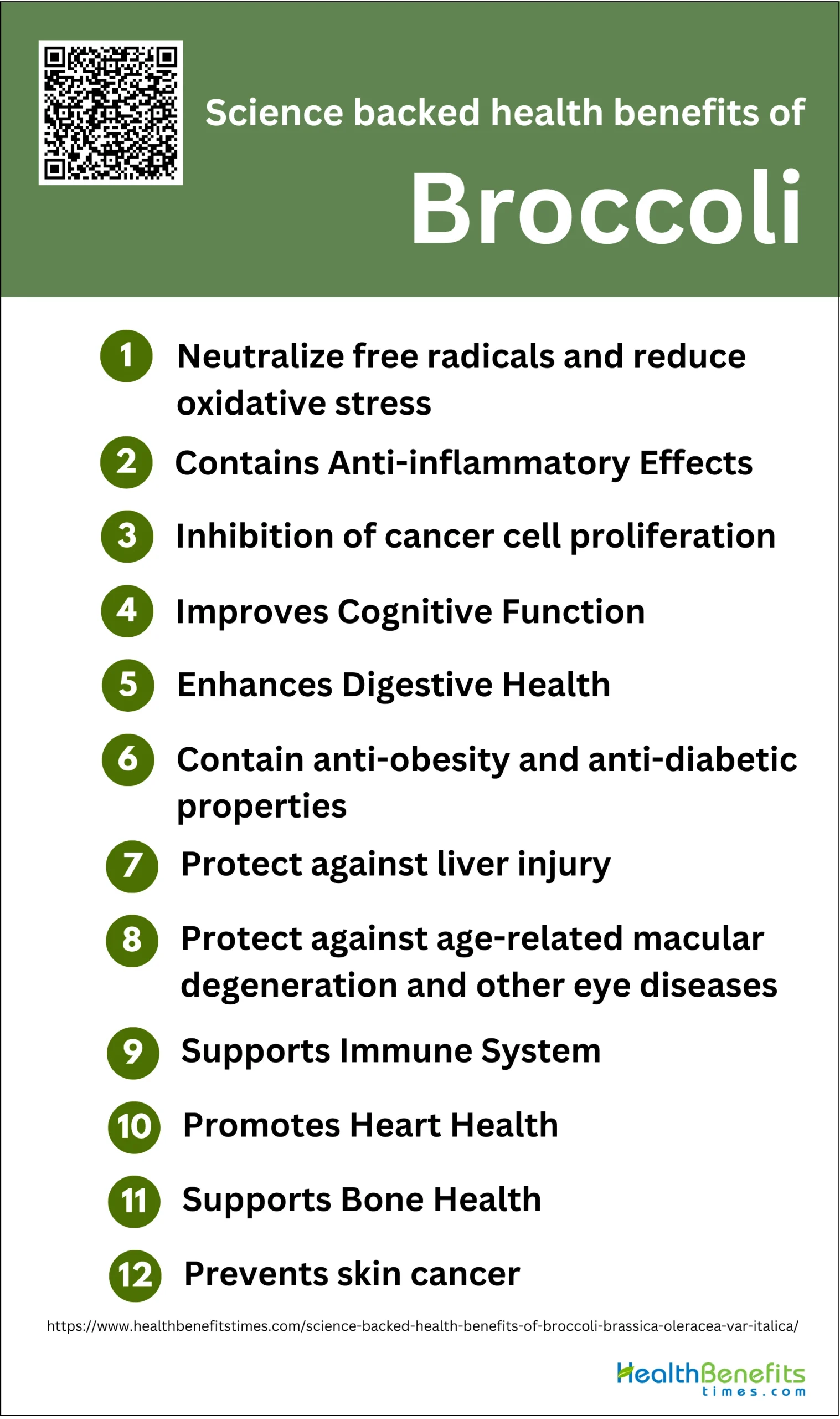 In conclusion, broccoli is a nutritional powerhouse with a wide array of science-backed health benefits. Its rich content of vitamins, minerals, fiber, and bioactive compounds like sulforaphane contribute to its remarkable ability to neutralize free radicals, reduce inflammation, inhibit cancer cell proliferation, improve cognitive function, enhance digestive health, support heart and bone health, boost the immune system, and potentially prevent skin cancer. The vegetable’s anti-obesity and anti-diabetic properties, along with its positive effects on eye health, make it an invaluable addition to a balanced diet. From supporting cellular health to promoting overall well-being, broccoli’s diverse nutritional profile and therapeutic potential underscore its importance as a functional food. Whether consumed raw, steamed, or roasted, incorporating broccoli into your regular diet can significantly contribute to improved health outcomes and disease prevention.