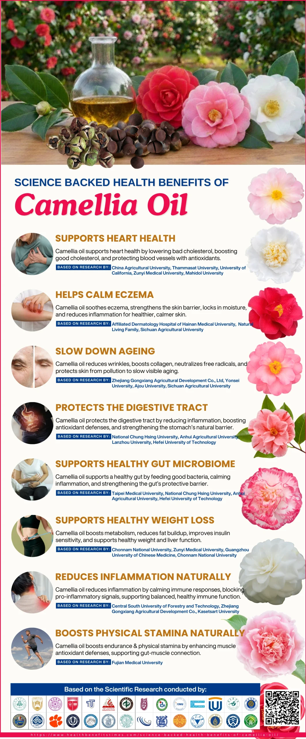 This oil has a long history. In traditional Chinese medicine and Japanese folk practices, it was used for a range of health issues. For example, people applied it to treat stomach pain, burns, and intestinal problems. In Japan, it’s also known as Tsubaki oil and has been a go-to for conditioning hair and skin. 2 Beyond these uses, it’s so commonly part of daily life that some consider it a functional food. That means it offers health perks beyond just basic nutrition, which makes sense given its high levels of unsaturated fatty acids and antioxidants. 3