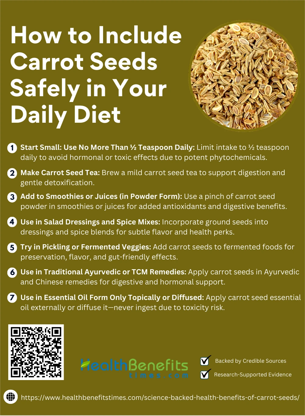Carrot seeds can be safely included in your daily diet through teas, powdered supplements, or diluted essential oils. Proper dosage and consultation with a healthcare provider are recommended for safe use.