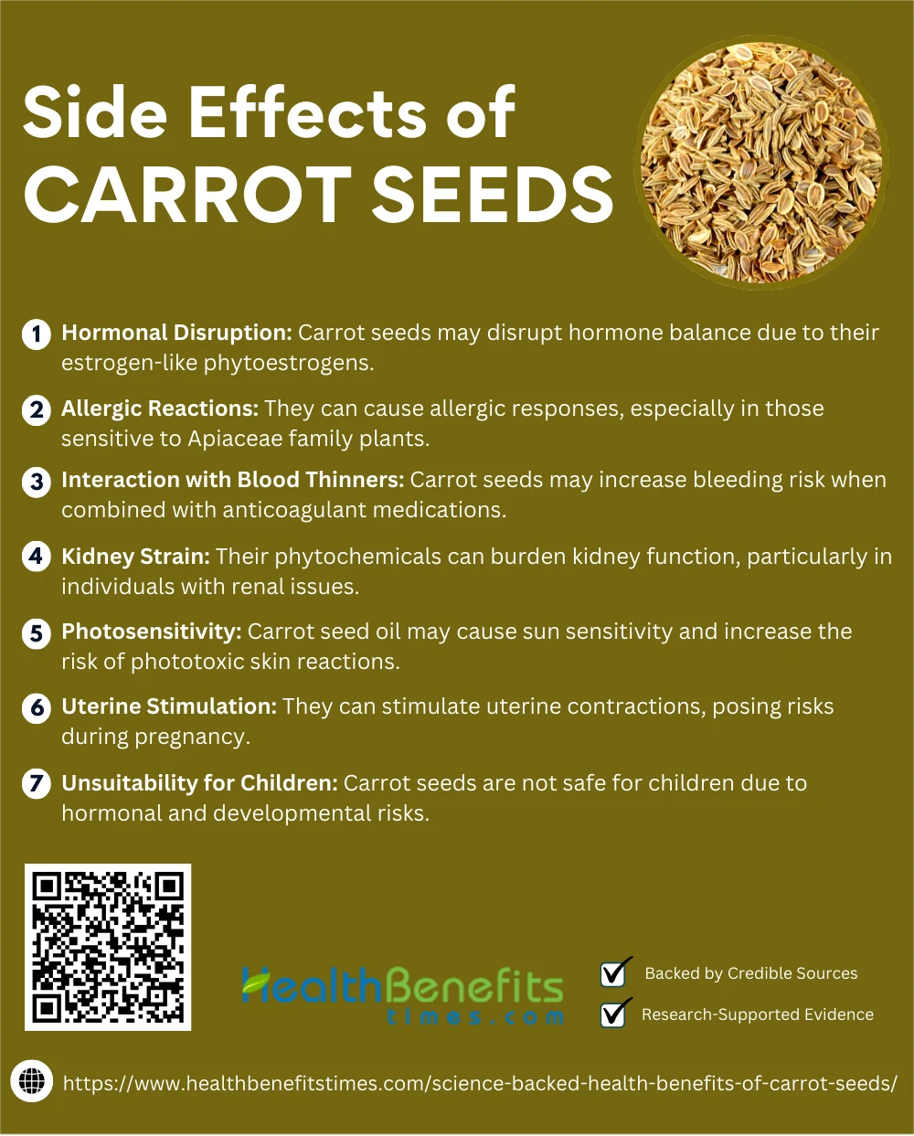 Carrot seeds may cause side effects such as allergic reactions, skin sensitivity, or hormonal disturbances when consumed in excess or used improperly, highlighting the importance of cautious and informed usage.