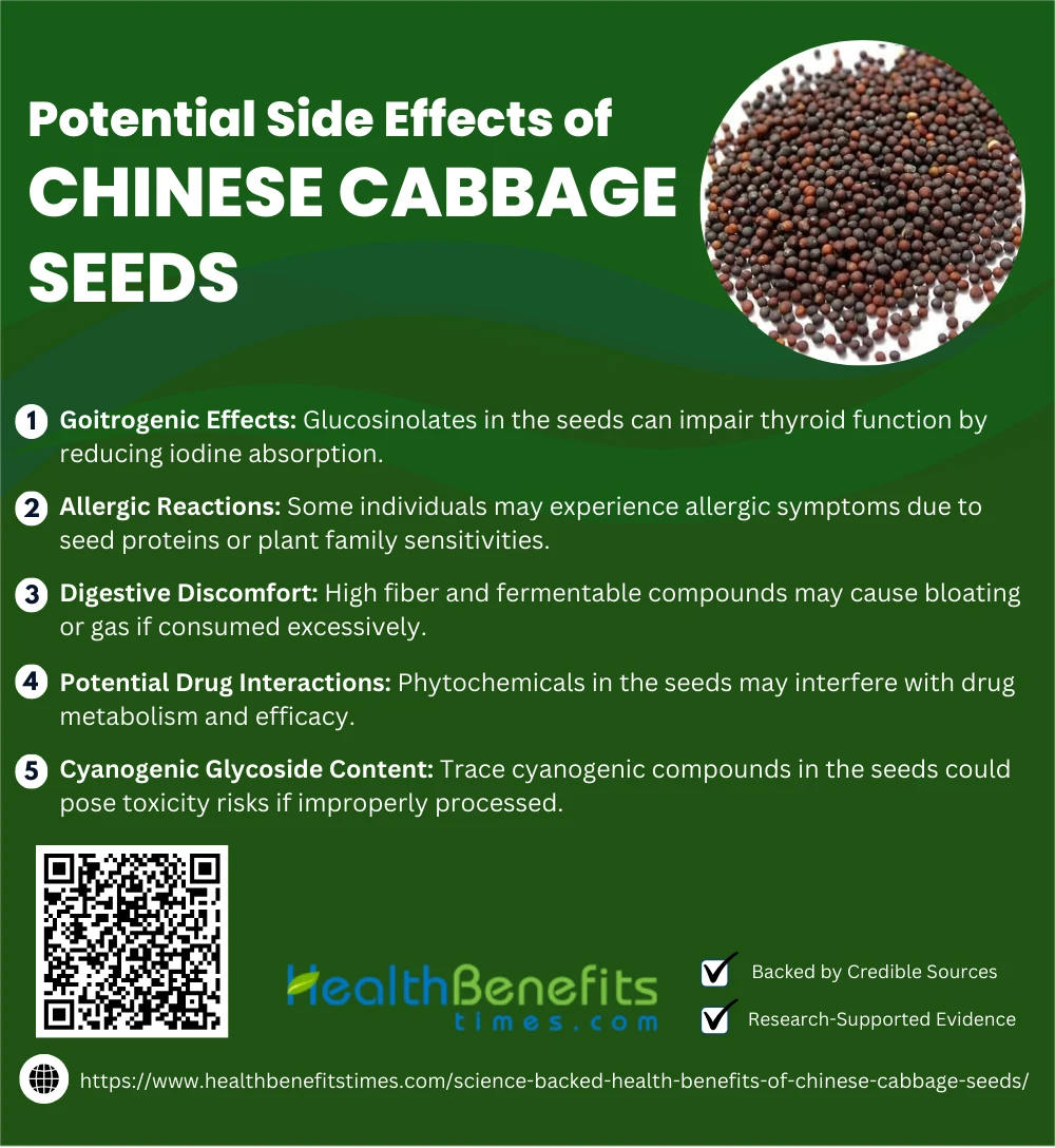 While Chinese cabbage seeds offer many health benefits, excessive consumption may cause side effects such as thyroid disruption, allergic reactions, or medication interactions, especially due to their goitrogenic and bioactive compounds.