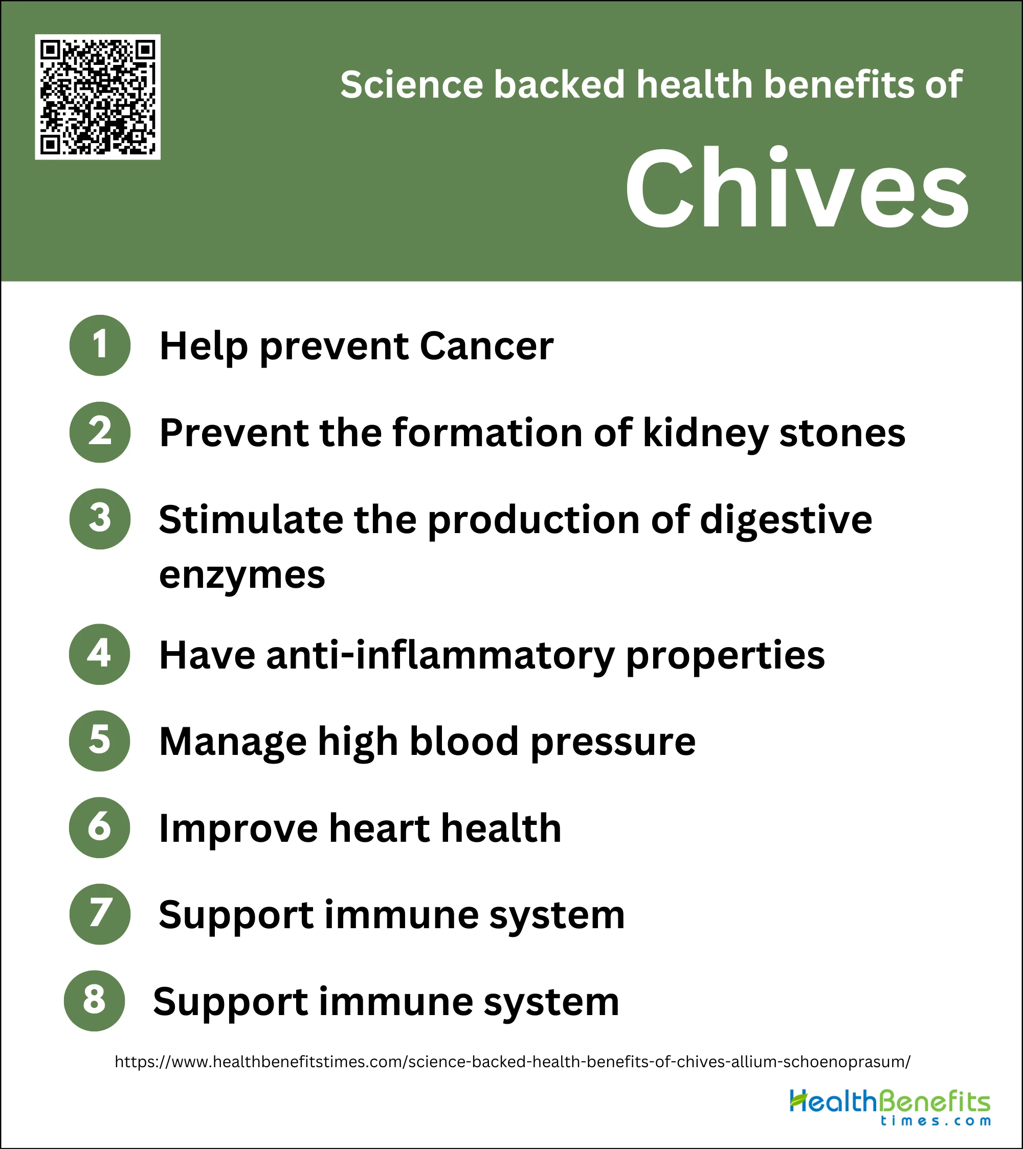 - Chives have anti-inflammatory, blood pressure management, and heart health improvement properties.