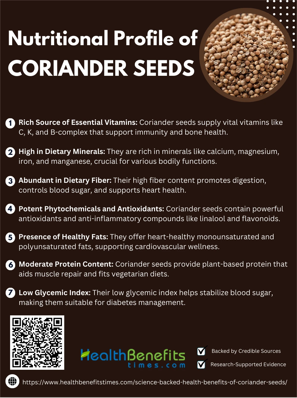 Coriander seeds are small but packed with nutrients, offering essential vitamins, minerals, fiber, and antioxidants. Their rich nutritional profile forms the foundation for many of their powerful, science-backed health benefits.
