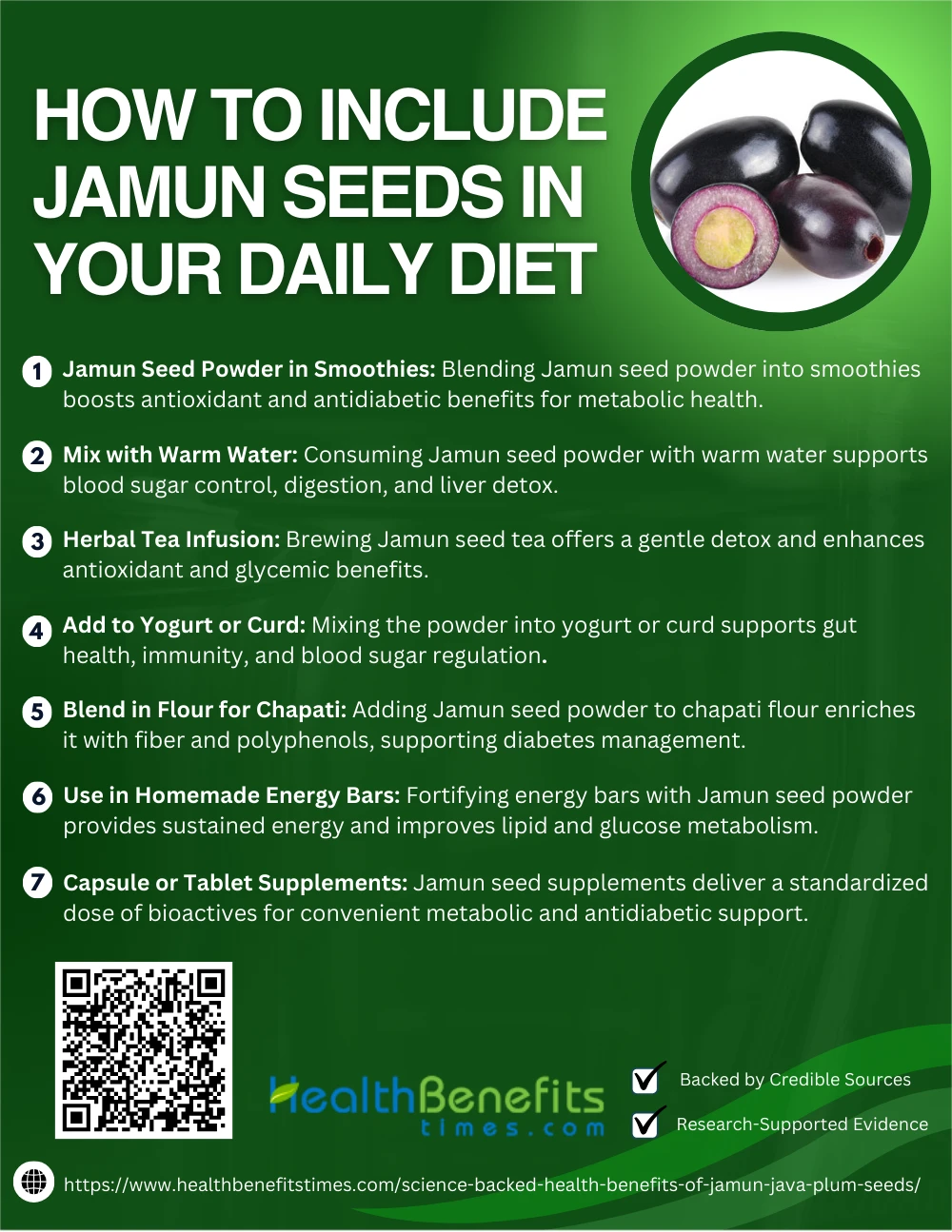 Jamun seeds can be easily added to your daily diet by using them in powdered form, smoothies, herbal teas, or capsules, offering convenient ways to enjoy their health benefits.