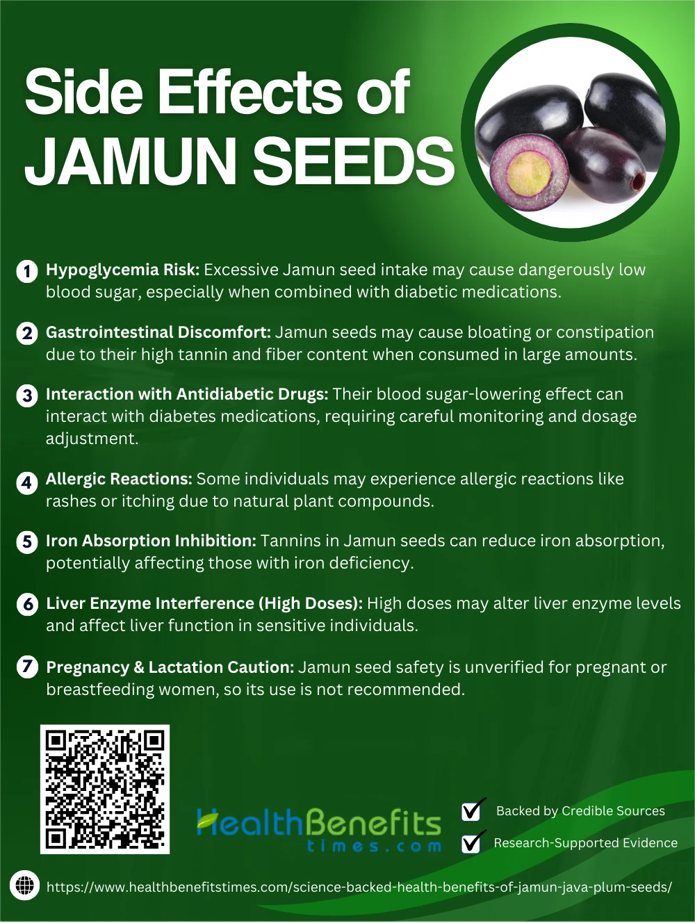 While Jamun seeds offer many health benefits, they may cause side effects like low blood sugar, allergies, or digestive discomfort if consumed excessively or without proper guidance from a healthcare professional.
