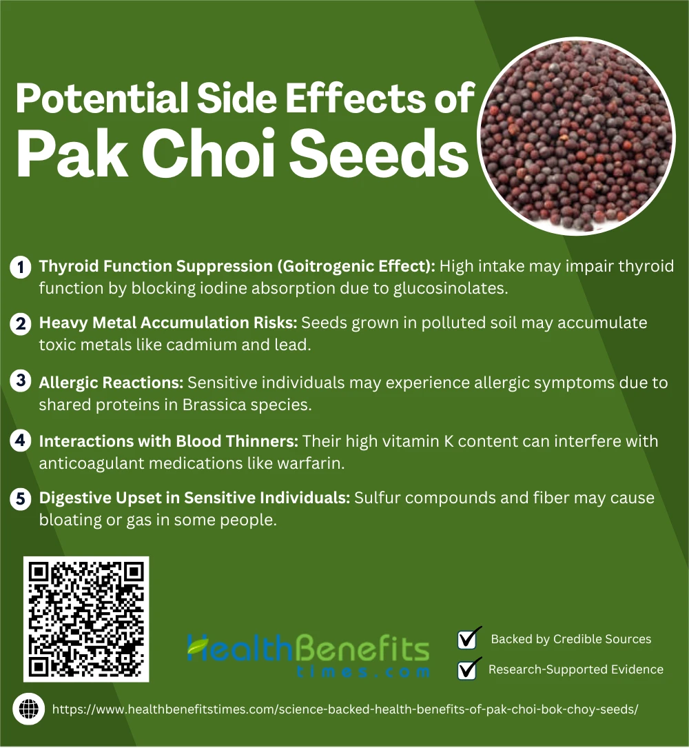 While Pak Choi seeds offer health benefits, potential side effects include thyroid interference due to goitrogens, digestive discomfort in sensitive individuals, and possible interactions with medications or allergic reactions.
