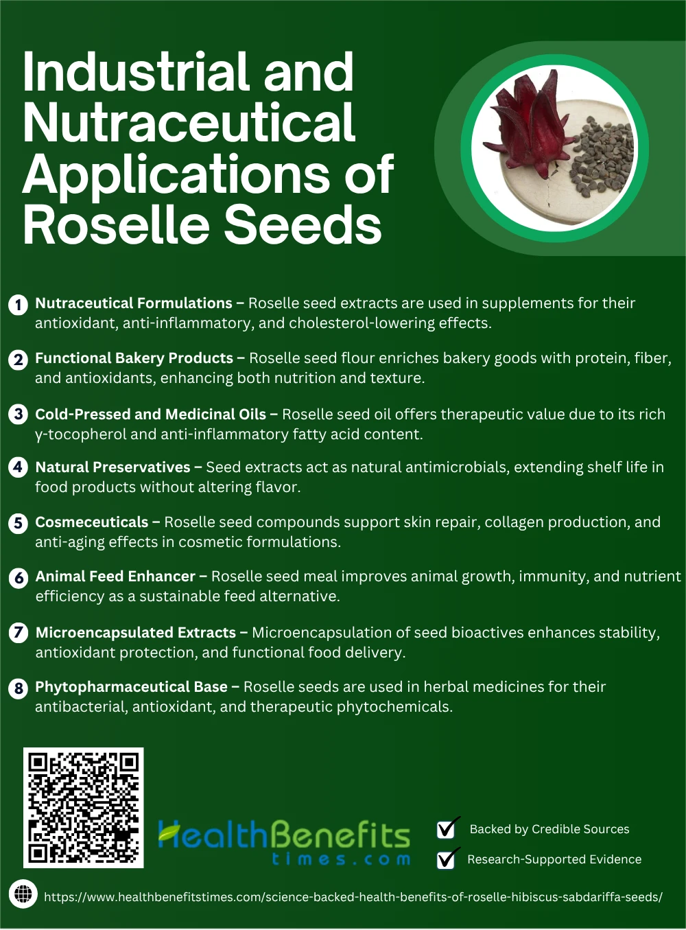 Roselle seeds hold promising industrial and nutraceutical applications, being utilized in oil extraction, animal feed, and functional food products due to their rich nutrient profile, bioactive compounds, and health-enhancing properties.