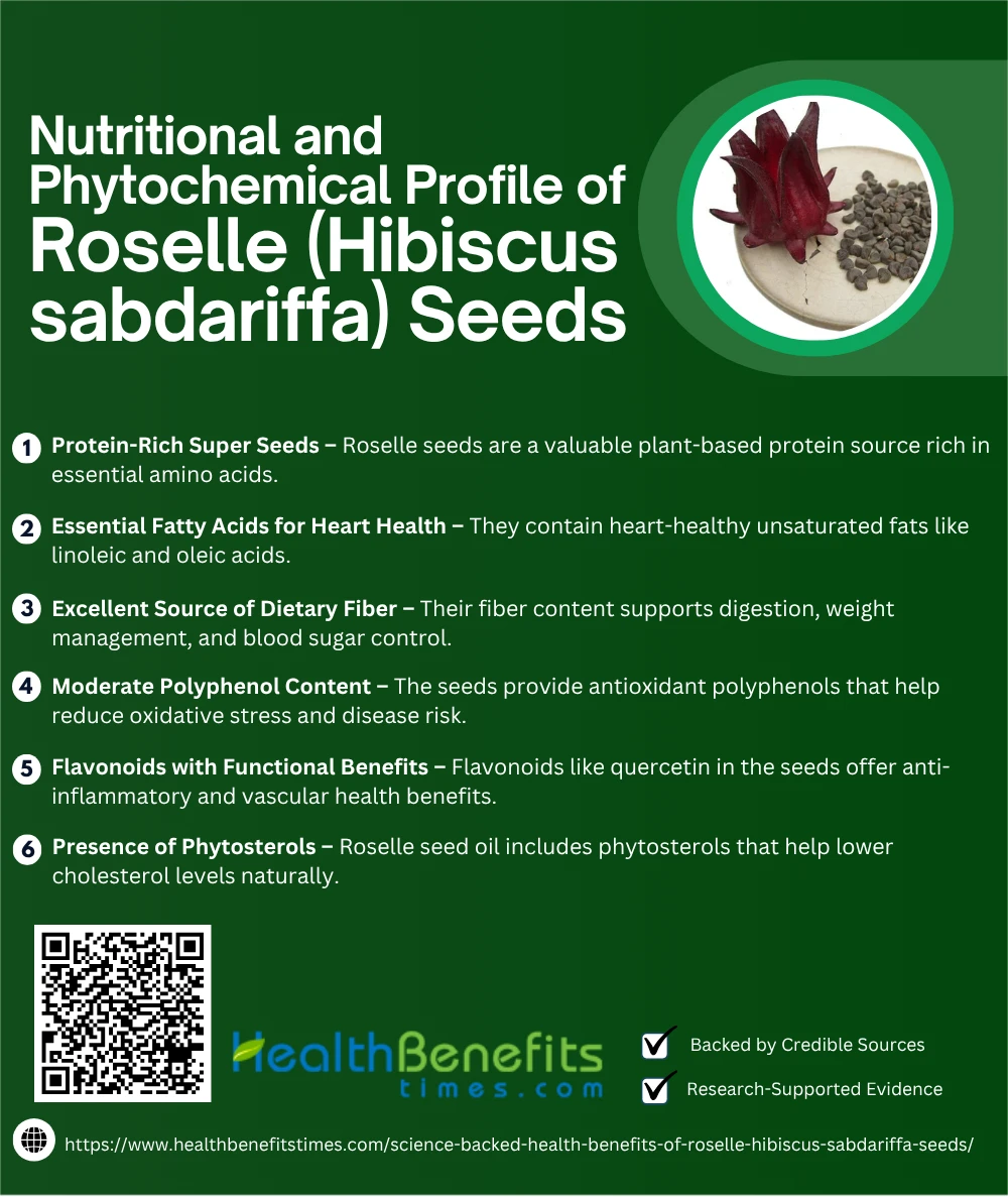 Roselle (Hibiscus sabdariffa) seeds are rich in essential nutrients and potent phytochemicals, offering proteins, healthy fats, antioxidants, and bioactive compounds that contribute to their growing therapeutic and nutritional value.