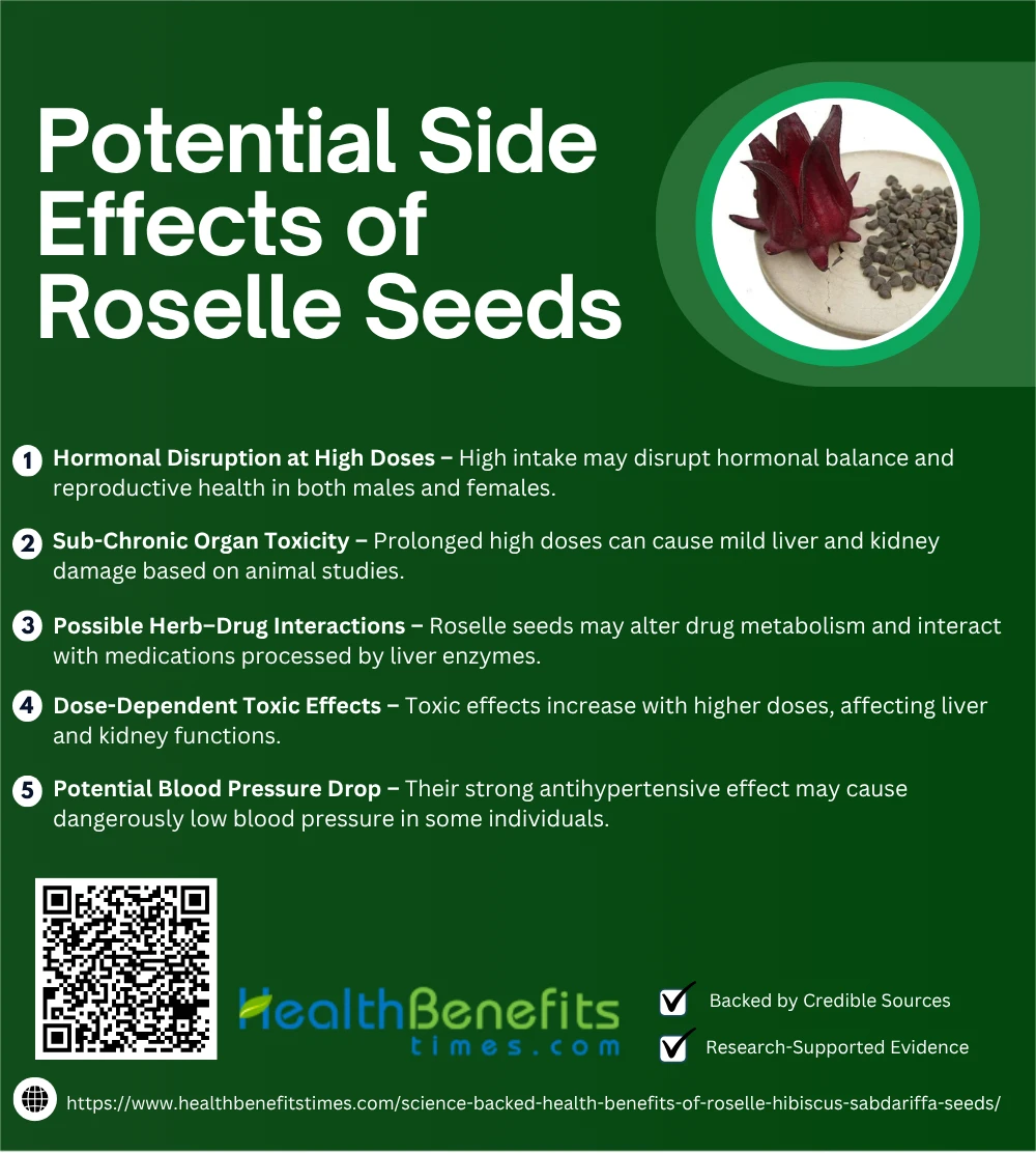 While Roselle seeds offer numerous health benefits, potential side effects include allergic reactions, digestive discomfort, or interactions with medications, especially when consumed in large amounts or without proper guidance.