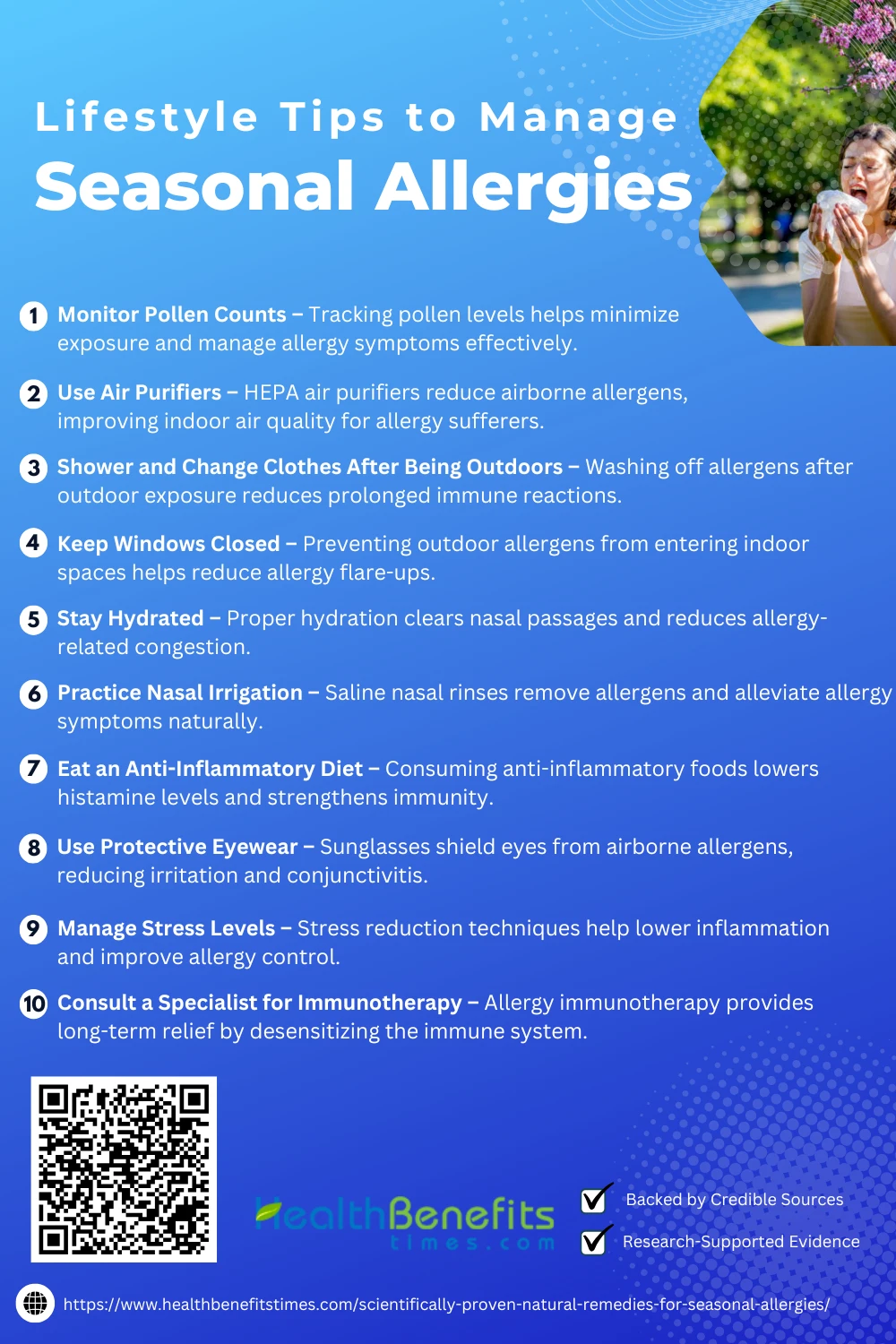 In conclusion, natural remedies such as honey, nasal irrigation, and probiotics offer scientifically supported solutions to manage seasonal allergies effectively. Incorporating these methods into your routine can provide relief while reducing dependence on conventional medications. However, it’s essential to consult a healthcare professional before trying new remedies, ensuring the best approach for your specific needs. With the right combination of natural treatments and lifestyle adjustments, you can experience significant improvement in allergy symptoms and overall well-being.