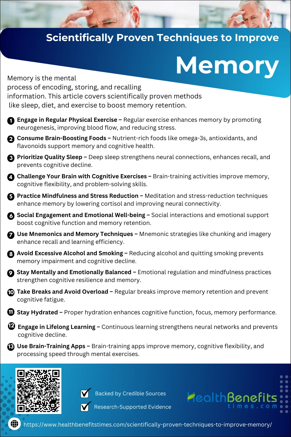 Improving memory requires a combination of scientifically proven techniques, including regular exercise, a balanced diet, quality sleep, mental stimulation, and mindfulness practices. By consistently incorporating these strategies into your daily routine, you can enhance cognitive function, boost recall, and protect brain health as you age. Small but meaningful lifestyle changes can make a significant difference in memory retention and overall mental sharpness.