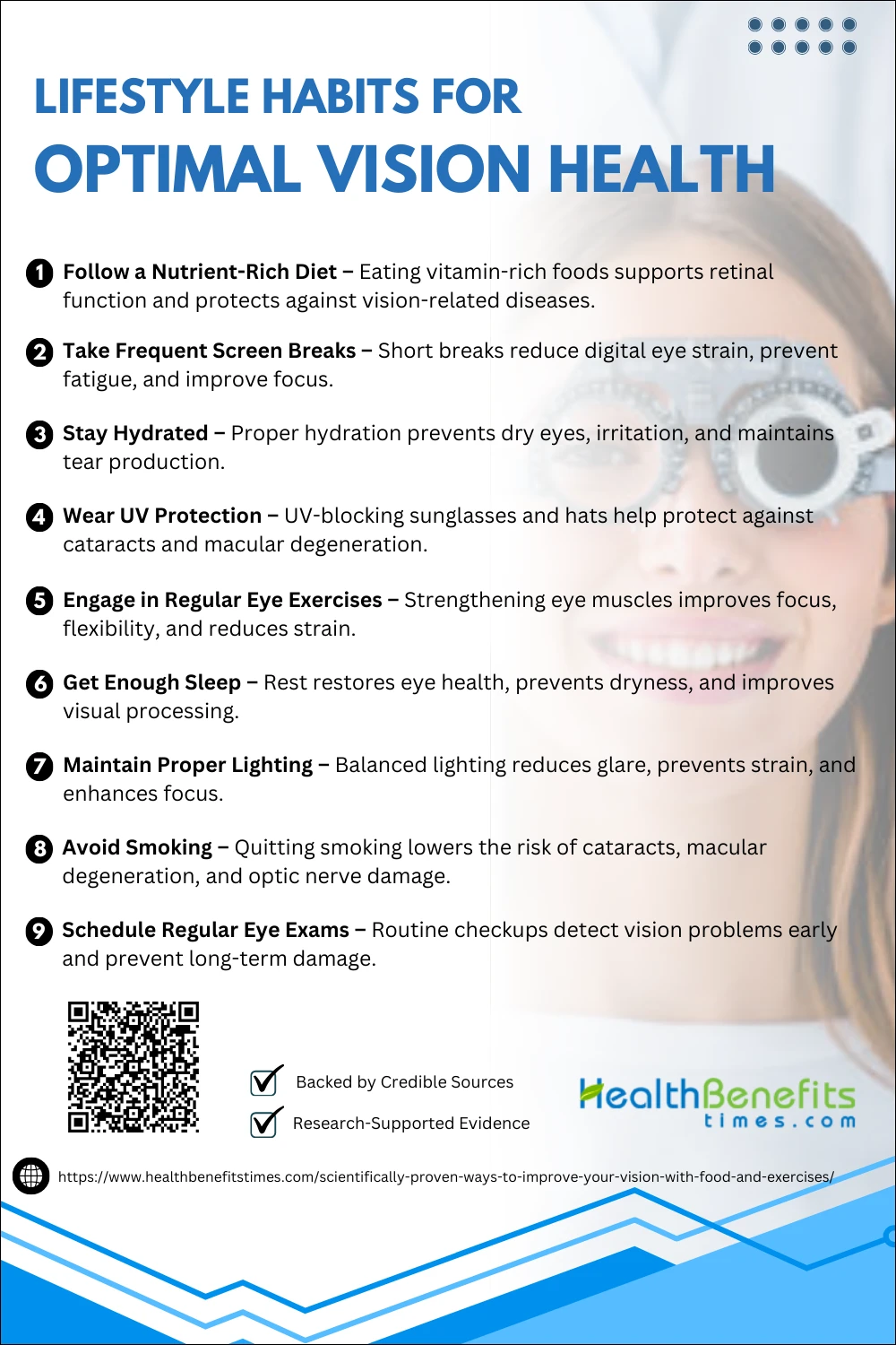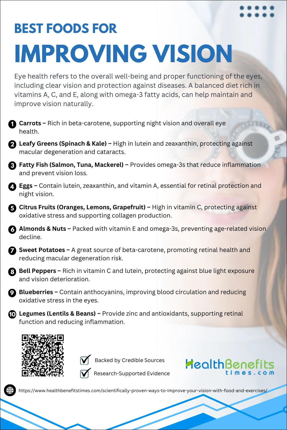 Improving your vision naturally requires a combination of nutrient-rich foods, effective eye exercises, and healthy lifestyle habits. By incorporating vision-boosting foods like leafy greens, fish, and nuts, along with regular eye exercises and proper screen habits, you can reduce strain, strengthen eye muscles, and protect against age-related decline. Prioritizing hydration, sleep, and regular eye checkups further ensures long-term eye health. While no method can guarantee perfect vision, adopting these scientifically proven strategies can significantly enhance and preserve your eyesight for years to come.