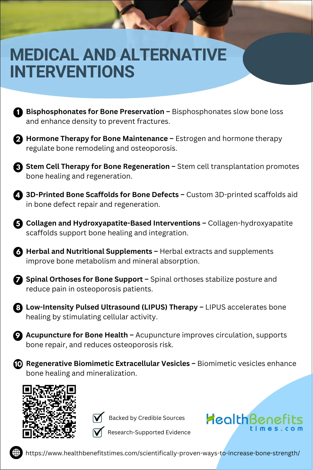 Medical and alternative interventions help maintain bone strength by combining medications, supplements, and holistic approaches. These methods support bone density, prevent fractures, and manage conditions like osteoporosis for long-term skeletal health.