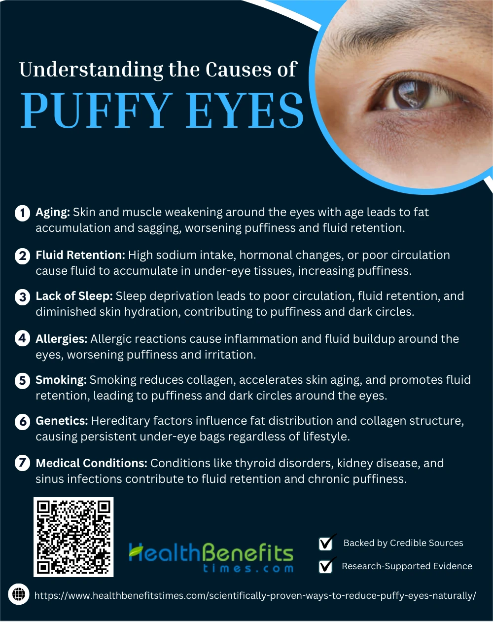 Underlying medical conditions such as thyroid disorders, kidney disease, and sinus infections can lead to fluid retention and persistent puffy eyes. (3✔) Research indicates that chronic inflammation and circulatory issues also contribute to periorbital swelling, exacerbating puffiness over time. (5✔)