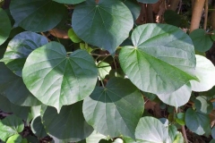 Large dark green simple leaves are heart-shaped to almost circular or broader than long, about 8-20 cm long and 6-15 cm across (3-8 inches long and 2.4-6 inches wide); 5- to 9-veined from the base, veins prominent, each of the main veins with a slit or elongated gland near the base. Leaves are velvety white to greyish, densely and finely tomentose below, olive-green and glabrescent (becoming hairless) on the upper surface. Apex shortly pointed; base deeply lobed; margins entire or minutely toothed. Petiole (leaf stalk) is up to 120 mm long, with stellate (star-shaped) hairs, sometimes hairless. Stipules (small appendages at the base of leaves) are broad, up to about 30 mm long and 15 mm wide, ovate-cordate, caducous (falling off during the life of the organism), sheathing the stem, falling off early to leave a scar almost all the way around the stem. In some Pacific islands there is a variant with bronze reddish green shoots and new leaves.