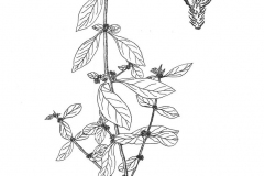 Stem is cylindric, many-branched and villous in lines and transversely at the nodes. It is solid and thin in dry conditions, the stem is longer, hollow and floating in aquatic conditions, reaching 1 cm in diameter. It is glabrous except for two opposite narrow lines of whitish hairs on the erect parts, and tufts of white hairs at the nodes.
