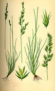 Sheep’s fescue or sheep fescue scientifically known as Festuca ovina is a species of grass of genus Festuca L. (fescue) and Poaceae ⁄ Gramineae (Grass family). It is occasionally confused with hard fescue (Festuca trachyphylla). The plant is native throughout Europe (with the exception of some Mediterranean areas) and eastwards across much of Asia; it has also been introduced to North America. Few of the popular common names of the plants are Common fescue, Sheep fescue, ovina and Blue Fescue. It is classified under the British NVC community CG2, i.e. Festuca ovina – Avenula pratensis grassland, one of the calcicolous grassland communities. This is one of the food plants for the caterpillars of several butterflies and moths, including the Gatekeeper and the Meadow Brown, the Small Heath, and the grass moth Agriphila inquinatella.