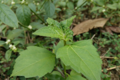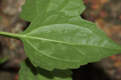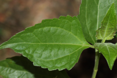 | Leaf | Leaves are simple, oppositely arranged leaves are 5-12 cm long and 3-7 cm wide and are triangular or egg-shaped in outline (i.e. ovate) and have a pointed tip (i.e. acute apex). They are hairy (i.e. pubescent) on both surfaces and have coarsely toothed (i.e. serrated) margins |