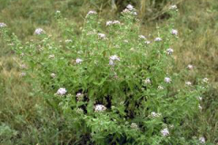 Siam weed is an upright or sprawling, rapidly growing, herbaceous semi-woody to woody perennial shrub that normally grows about 1.5 to 3 m tall in the open, however it may reach greater heights about 6-20 m when climbing over trees and other taller vegetation. The plant is found growing in croplands, neglected pastures, forest margins, disturbed rainforests, cultivated lands, forest clearings, wastelands, along forest trails, fence rows, roadsides, waterways, bush land, riparian zones, disturbed sites, agricultural areas, natural forests, planted forests and grasslands. The plant grows in many soil types but prefers well-drained soils. It does not tolerate shade and thrives well in open areas. The plant has shallow, fibrous abundantly branched root that does not penetrate beyond 20-30 cm in most soils. Many paired branches grow off the main stem. The base of the plant becomes hard and woody while the branch tips are soft and green. It has soft stems but the base of the shrub is woody. In shady areas it becomes etiolated and behaves as a creeper, growing on other vegetation.
