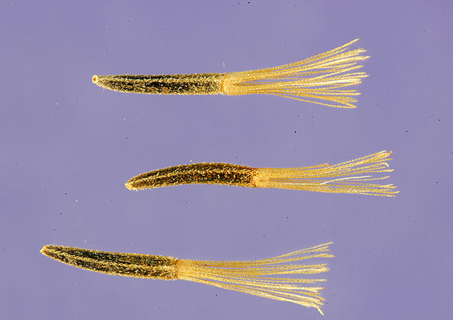 | Shapes | Narrow and elongated, black or dark brown seeds (achenes) that are 4-5 mm long and topped with a ring (pappus) of white to brownish coloured hairs (5-6 mm long). |