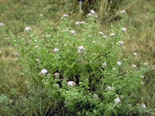 The oppositely arranged leaves are 5-12 cm long and 3-7 cm wide and are triangular or egg-shaped in outline (i.e. ovate) and have a pointed tip (i.e. acute apex). They are hairy (i.e. pubescent) on both surfaces and have coarsely toothed (i.e. serrated) margins. These leaves are borne on stalks (i.e. petioles) up to 6 cm long (usually 10-15 mm), and give off a strong pungent, aromatic odor when crushed.