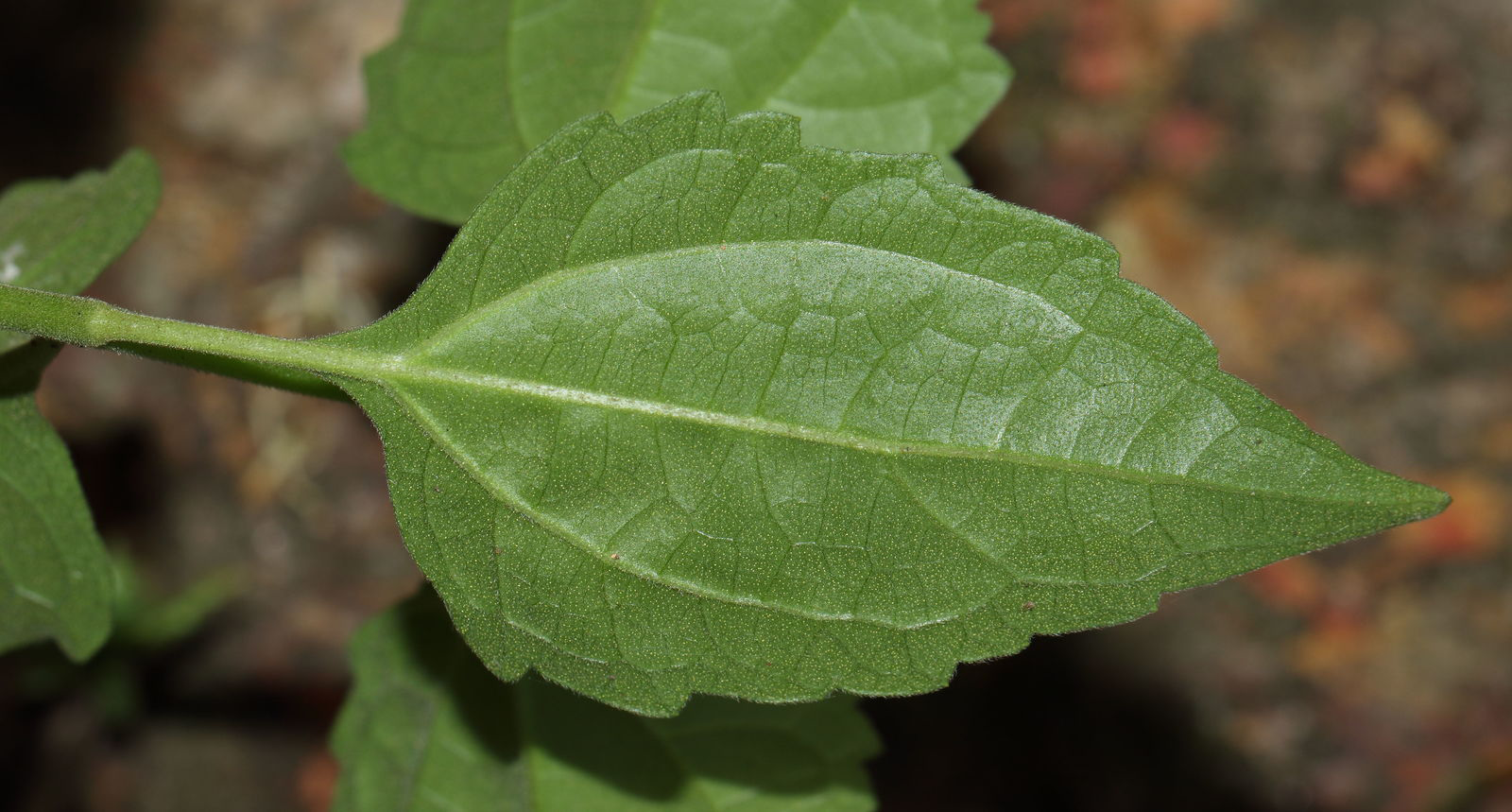 | Leaf | Leaves are simple, oppositely arranged leaves are 5-12 cm long and 3-7 cm wide and are triangular or egg-shaped in outline (i.e. ovate) and have a pointed tip (i.e. acute apex). They are hairy (i.e. pubescent) on both surfaces and have coarsely toothed (i.e. serrated) margins |
