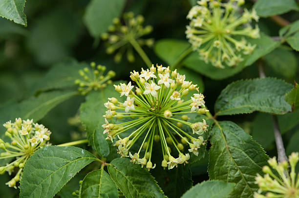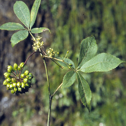 The plant has one or more globose umbels 1.5 inches (3.8 cm) wide with purplish male and yellow female flowers terminating the shoots. Each individual plant produces three types of flowers, male, female and bisexual, which bloom in early July. Siberian ginseng flowers are cross-pollinated mostly by bees such as Bombus, Halietus, and Megachile. Pollinated flowers develop into small round bluish black berrylike fruits about 0.5 inches (1.3 cm) in diameter when mature. The Siberian ginseng is usually made from the dried roots. Traditional Chinese Medicine has used Siberian ginseng for reducing lethargy, fatigue, and low stamina as well as increasing endurance and resilience to environmental stresses. It helps to increase endurance and mental performance in patients with mild fatigue and weakness.