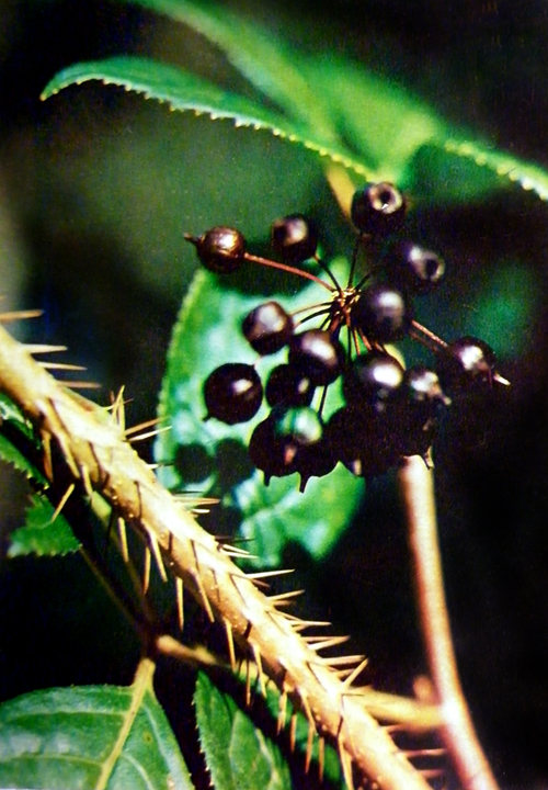 Eleutheroccocus senticosus, commonly known as Siberian ginseng, Eleuthero, Russian ginseng, Devil’s shrub, Touch-me-not, Wild pepper, Shigoka, Ci wu ja, eleuthero, Kan Jang, chi wu cha, thorny Russian pepperbush, thorny ginseng is a slow-growing, perennial shrub native to the South-East Russia, Northern China, Siberia, Korea and Japan. Eleutherococcus (from Greek) means “free-berried,” and senticosus, from the Latin word sentis (thorn-bush, briar) is an adjective meaning “thorny” or “full of briers or thorns.” It belongs to the Araliaceae family, which also includes the Panax genus of true ginseng plants. Despite its name, it is completely different from American (Panax quinquefolius) and Asian ginseng (Panax ginseng), and has different active chemical components. The active ingredients in Siberian ginseng, called eleutherosides, may stimulate the immune system. Siberian ginseng has been used in China for thousands of years to enhance the body’s vital energy, restore memory, and prevent colds and flu. The Siberian ginseng is usually made from the dried roots.
