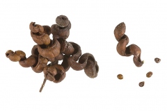 Curled, twisted, sickle shaped and leathery indehiscent pod