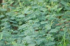 The leaves are twice-compound (i.e. bipinnate) and usually somewhat bluish-grey or silvery-green in color (i.e. they are slightly to very glaucous). These leaves are 6-17 cm long and are alternately arranged along the stems and have a short hairy leaf stalk (i.e. petiole) that is 1 to 15 mm long. The extension of this stalk (i.e. rachis), which bears numerous (10-30) pairs of leaf branchlets (i.e. pinnae), is 3-17 cm long (usually 5-10 cm long). It is finely hairy and bears a small raised structure (i.e. gland) at the junction of the each of the pairs of branchlets (i.e. pinnae). The leaf branchlets (15-55 mm long) each bear numerous (14-68) pairs of small, narrowly oblong to linear leaflets (i.e. pinnules). These leaflets are 1.5-6 mm long and 0.4-1 mm wide and are very crowded and have rounded or pointed tips (i.e. obtuse to acute apices). Their upper surfaces are mostly hairless (i.e. glabrous), while their margins and lower surfaces are usually finely hairy (i.e. pubescent).