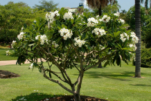Singapore Plumeria is a large shrub or small tree that grows about 5-10m high. The plant is best grown in rich, dry to medium moisture, well-drained loams. Branchlets are pale green, thick and fleshy. Leaves are alternate, mostly clustered at branch tips, petiolate, obovate to oblong-obovate, to 25 cm long, dark green and shiny adaxially, tertiary venation strongly prominent abaxially and apex rounded. Flowers are large, fragrant, waxy and showy with large deciduous bracts. Calyx 5-lobed, lobes equal or sub equal. Corolla salver form or funnel shaped, white, 4 cm across, throat yellow, lobes 5, spreading, slightly recurved. Stamens inserted at or near base of corolla tube. Fruits are cylindrical seed pods about 3-5 inches long which are rarely formed in cultivation. Stem, branches and leaves consists of milky sap. Plumeria are valued as landscape plants and ornamentals and for their flowers.