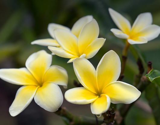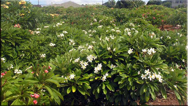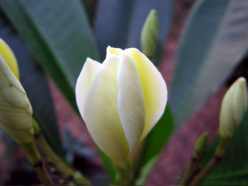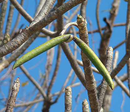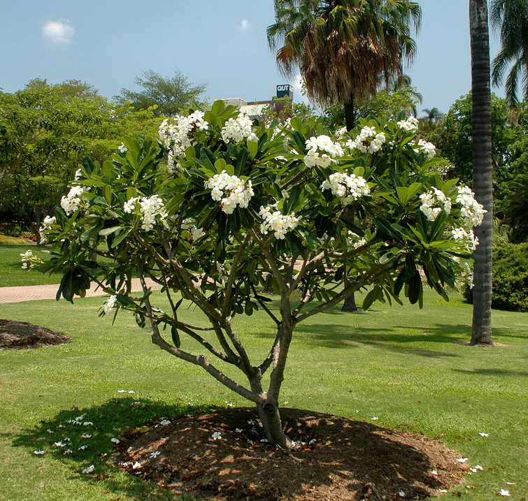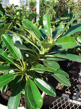 Singapore Plumeria is a large shrub or small tree that grows about 5-10m high. The plant is best grown in rich, dry to medium moisture, well-drained loams. Branchlets are pale green, thick and fleshy. Leaves are alternate, mostly clustered at branch tips, petiolate, obovate to oblong-obovate, to 25 cm long, dark green and shiny adaxially, tertiary venation strongly prominent abaxially and apex rounded. Flowers are large, fragrant, waxy and showy with large deciduous bracts. Calyx 5-lobed, lobes equal or sub equal. Corolla salver form or funnel shaped, white, 4 cm across, throat yellow, lobes 5, spreading, slightly recurved. Stamens inserted at or near base of corolla tube. Fruits are cylindrical seed pods about 3-5 inches long which are rarely formed in cultivation. Stem, branches and leaves consists of milky sap. Plumeria are valued as landscape plants and ornamentals and for their flowers.