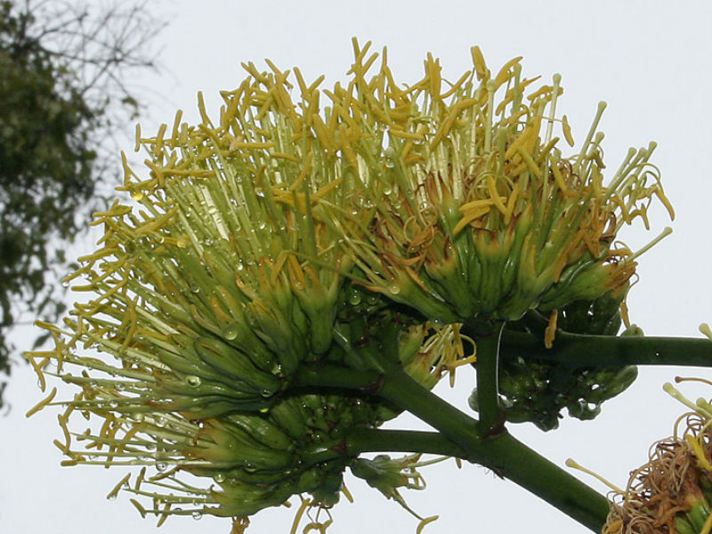 Agave sisalana is a robust and monocarpic herbaceous perennial plant having short thick stem measuring 120 cm by 20 cm. It has basal rosette of leaves which is 1.5 to 2 meters high. When young, leaves are glaucous, linear to lanceolate, straight and are about 100 to 150 cm long by 10 to 15 cm wide. Inflorescence is 2 to 8 meters tall, a panicle on a long peduncle and branching at upper half. Braches are widely spreading measuring 30 to 100 cm by 2 cm. Each branch bears 40 flowers and inflorescence branches after anthesis bears numerous bulbils. Flowers are erect, protandrous, strongly odorous and pale yellowish green. Tube is 1 to 2 cm long with obovate to oblanceolate lobes on an inner side of the top with tuft of haris. Fruit is an ellipsoid capsule in green that turns black when matured and contains 150 seeds. Seeds are thin, flat, black and rounded to deltoid.