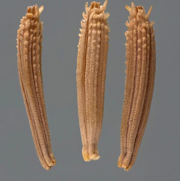 Fertile fruits are followed by achene oblong, tapered at both ends, lacking hairs, pale to dark brown, and 3-4 mm long, with many lengthwise ribs, pointed tubercles near the top, and to 6 small scales at the apex, surrounding the point of beak attachment. Beak is slender, 5-6 mm long, not including the pappus which consists of many equal, fine, white hairs about 5 mm long.